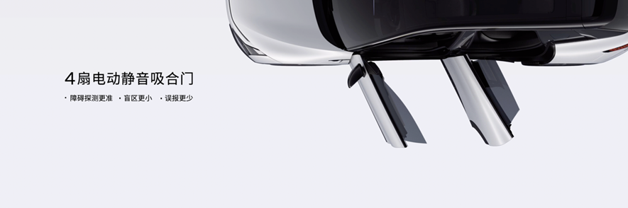 全车无车外门把手设计,4扇电动门配置静音吸合功能。车门集成4颗毫米波雷达,相比超声波雷达避障更精准,盲区更小、误报更少。