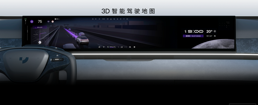 集度的U型方向盘设计率先在国内实现量产,不遮挡前排3D一体化大屏,用户可以自由完整地获取屏幕信息,并为驾驶员提供精确、轻便、舒适的转向体验。一体式超薄出风口贯穿中控面板,营造出干净整洁的布局。