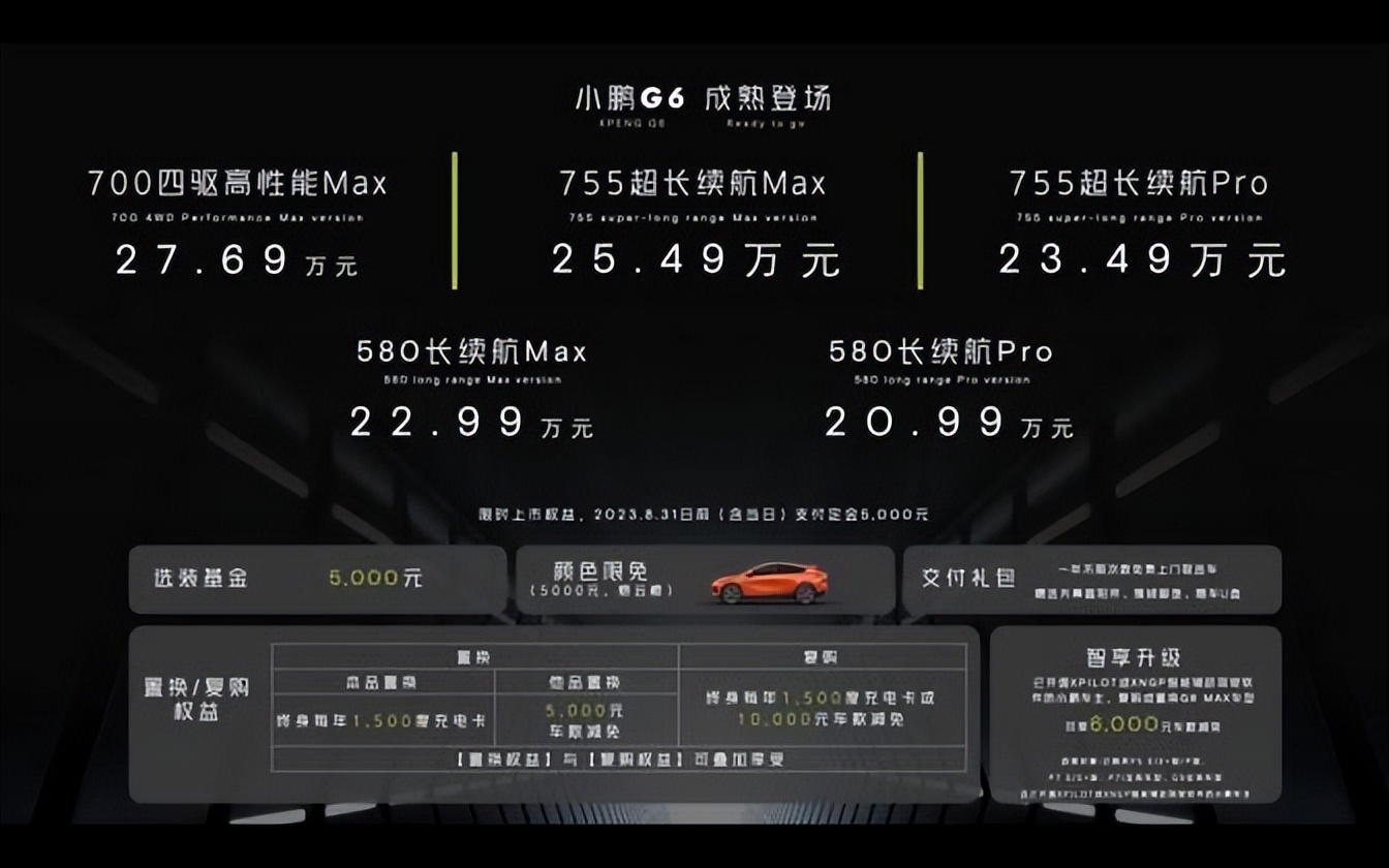 在公布价格的同时,小鹏汽车还公布了选装基金、颜色限免、交付礼包、增换购权益以及智享升级五大限时上市权益。官方将其定调为25万级最强智能电动SUV。